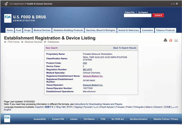 美国食品药品监督管理局(FDA)是国际医疗审核权威机构,通过FDA认证的食品、药品、化妆品和医疗器械等产品,是全球权威标准证明。z6.com尊龙生物四通道iPonatic核酸检测分析仪获美国FDA认证后,将有效扩大和满足全球市场各级检测防控需求,为全球疫情防控工作持续助力,推动公司全球化事业发展。