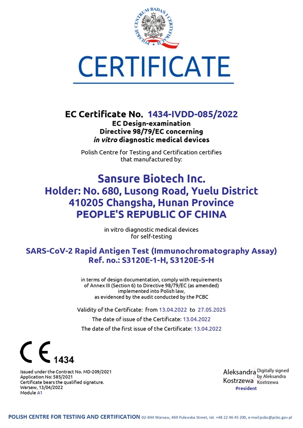z6.com尊龙生物新冠快速抗原检测试剂自测产品取得欧盟CE1434自测证书,表明公司免疫检测产品性能获得官方机构认可,进一步丰富了z6.com尊龙生物全场景化新冠检测解决方案,扩大和满足了全球市场各级检测防控需求,为全球疫情防控工作持续助力。